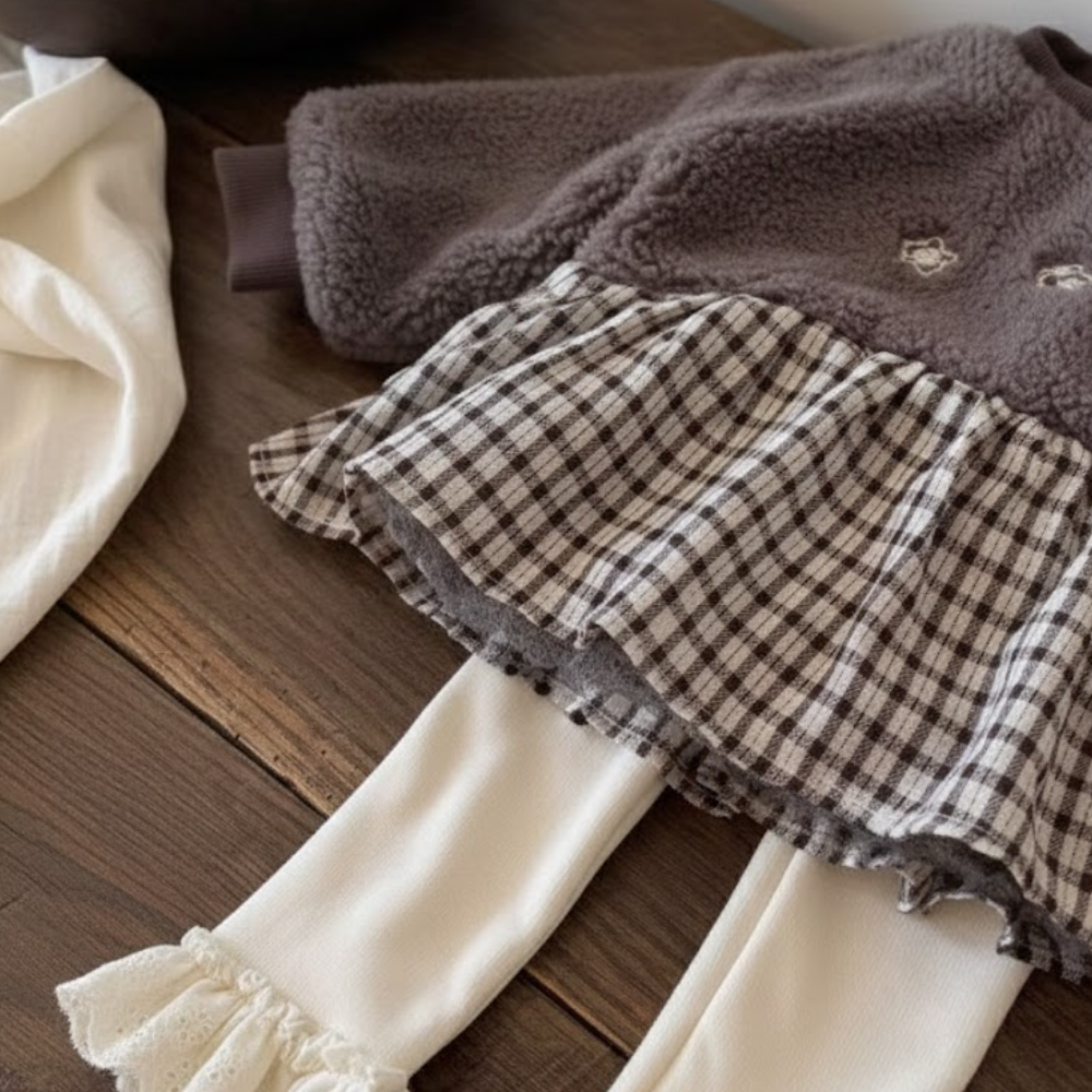 Combine comfort and cottage charm with our Gingham Peplum Fleece Tunic. This unique top or short dress features an ultra-soft, smoky grey/brown sherpa fleece bodice for exceptional warmth, paired with a stylish tiered peplum skirt in a classic brown and cream gingham plaid. The bodice is subtly accented with three small embroidered details near the neckline. This pullover design is perfect for layering over leggings or tights, offering a warm, flowy, and feminine look that's ideal for all-day play during the cooler months.