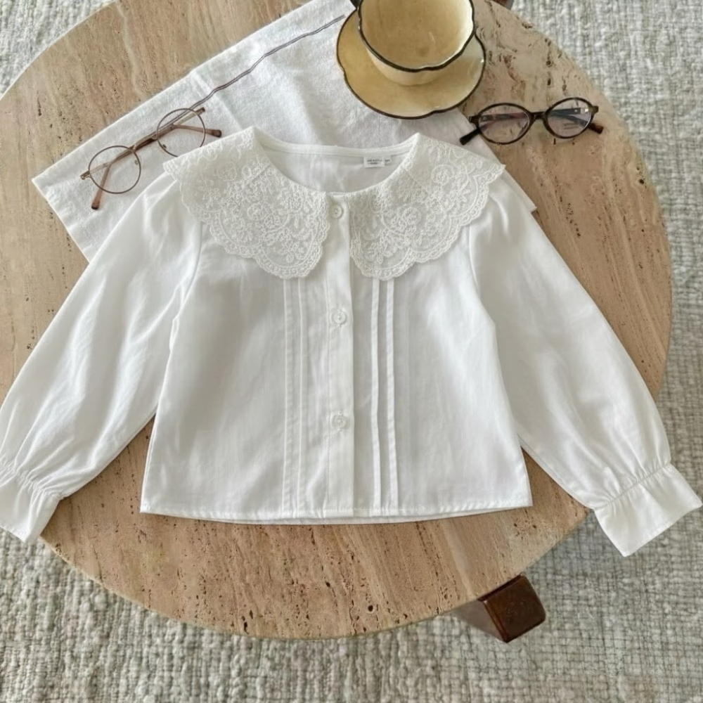 A sweet white long-sleeve blouse for girls, featuring a delicate embroidered lace Peter-Pan collar, front pleats, and soft breathable cotton for all-day comfort. Perfect for pairing with skirts, trousers, or layered under jumpers for a classic, polished look.