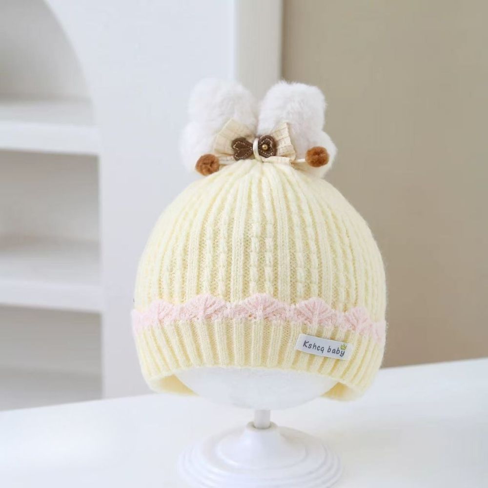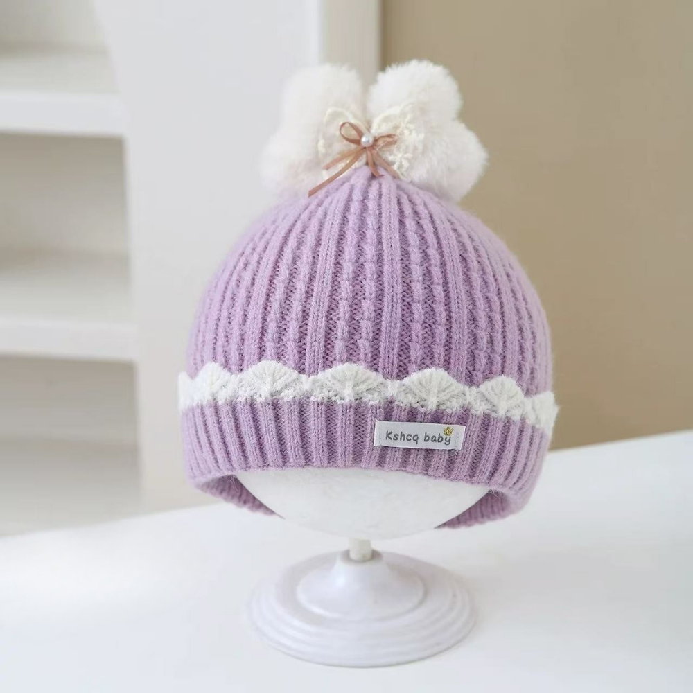 A cozy ribbed knit winter hat for babies and toddlers, available in beige, red, pink, yellow, and lavender. Features a fluffy double pom-pom bow on top with a tiny ribbon accent and a delicate scallop-knit trim for a cute, playful touch. Soft, warm, and perfect for chilly days.