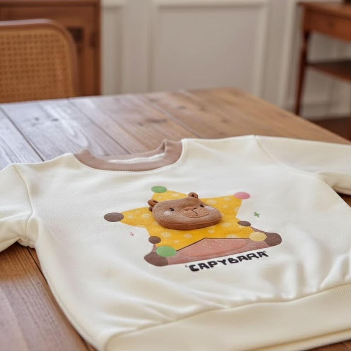 This cozy 2-piece set brings both cuteness and comfort to everyday wear. The cream sweatshirt features a playful 3D capybara design sitting in a cheerful star, paired with soft, elastic-waist brown jogger pants. Perfect for active toddlers and kids, this set is designed for all-day comfort while adding a fun and unique touch to their wardrobe. Great for daycare, playdates, or family outings.