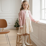 Dress her in charming vintage style with this perfectly coordinated Cottage Bloom Dress & Knit Cardigan Set. The outfit includes a lovely short dress featuring an all-over ditsy floral print in soft pink and green on a creamy white background. The dress has delicate ruffles at the neck and a tiered skirt for a sweet, flowy look. Paired with a soft, essential Pink Knit Cardigan with classic button closures, this set is ideal for keeping warm and stylish. The outfit is lined with plush fleece, ensuring it is warm enough for cooler weather.