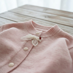 A soft blush-pink knit cardigan for girls, featuring delicate leaf-and-berry embroidery near the neckline and matching covered buttons for a sweet, polished look. Made with a cozy wool-blend feel, ribbed cuffs, and hem to keep your little one warm during chilly days.