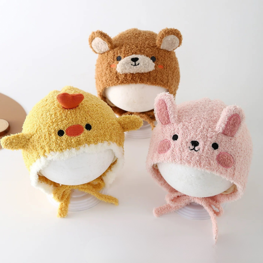 Adorable plush textured winter hats for babies and toddlers, available in four playful styles:
