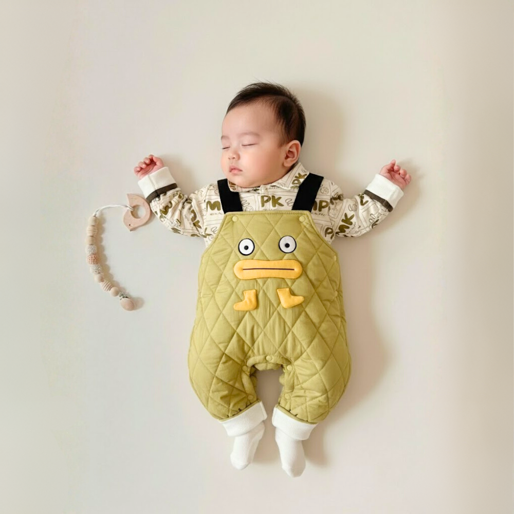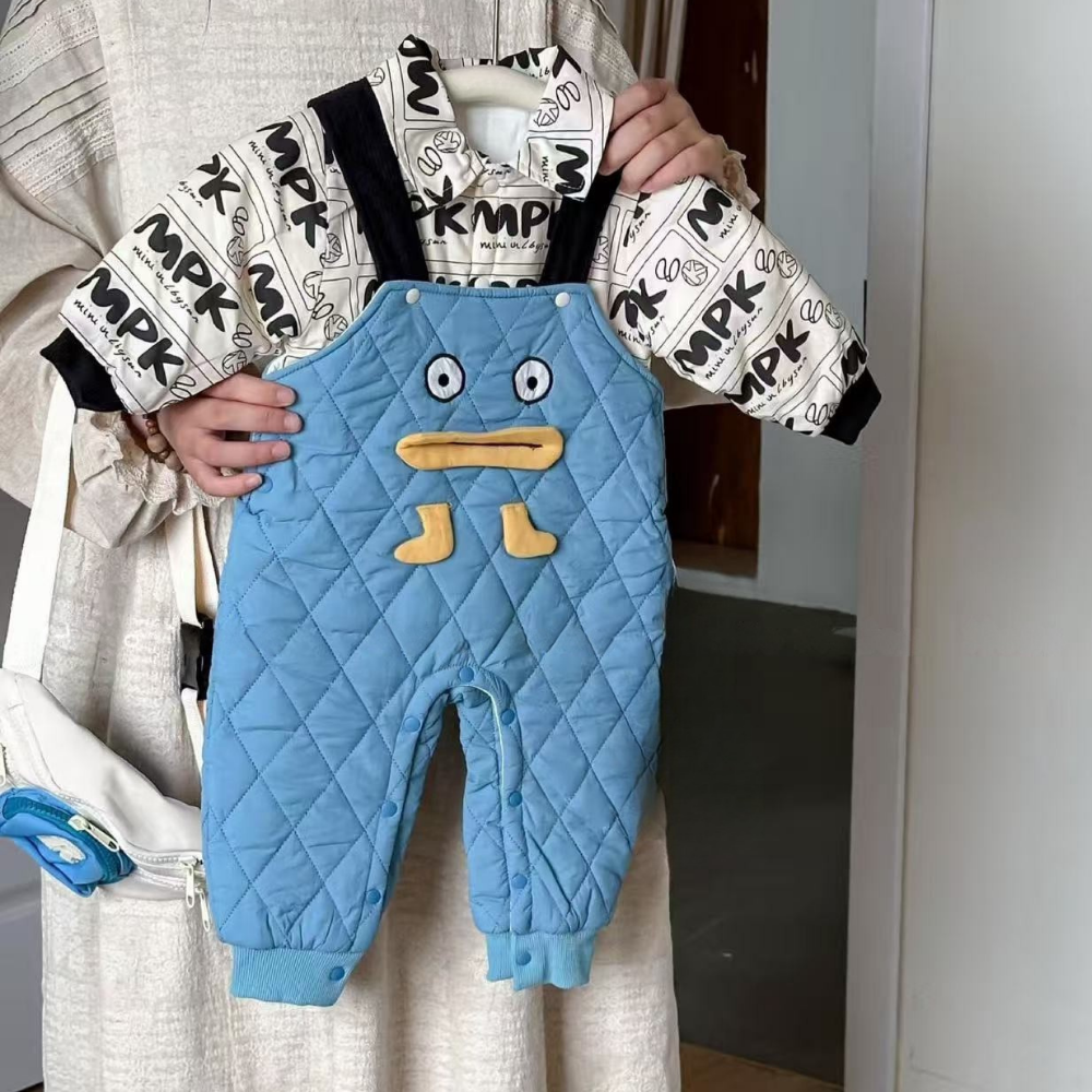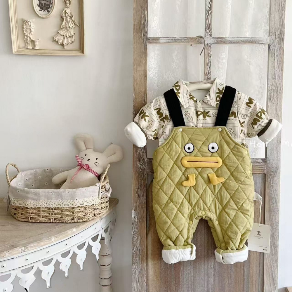 Our Quilted Duckling Overalls Set brings cozy warmth and playful charm together for your little one. Featuring a soft printed shirt paired with quilt-textured overalls decorated with an adorable duck face, this set is perfect for winter outings, photos, or creating sweet everyday looks. Snaps at the legs make diaper changes easy, while the padded design keeps baby snug and comfortable.