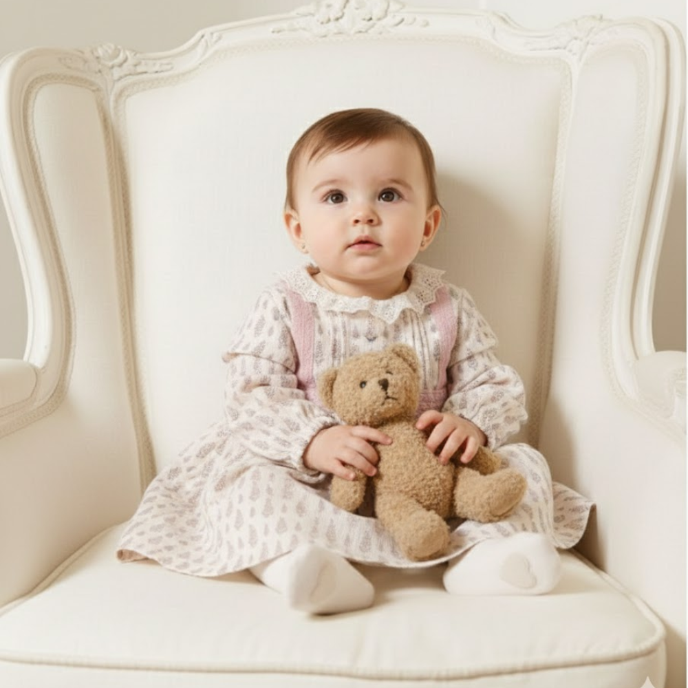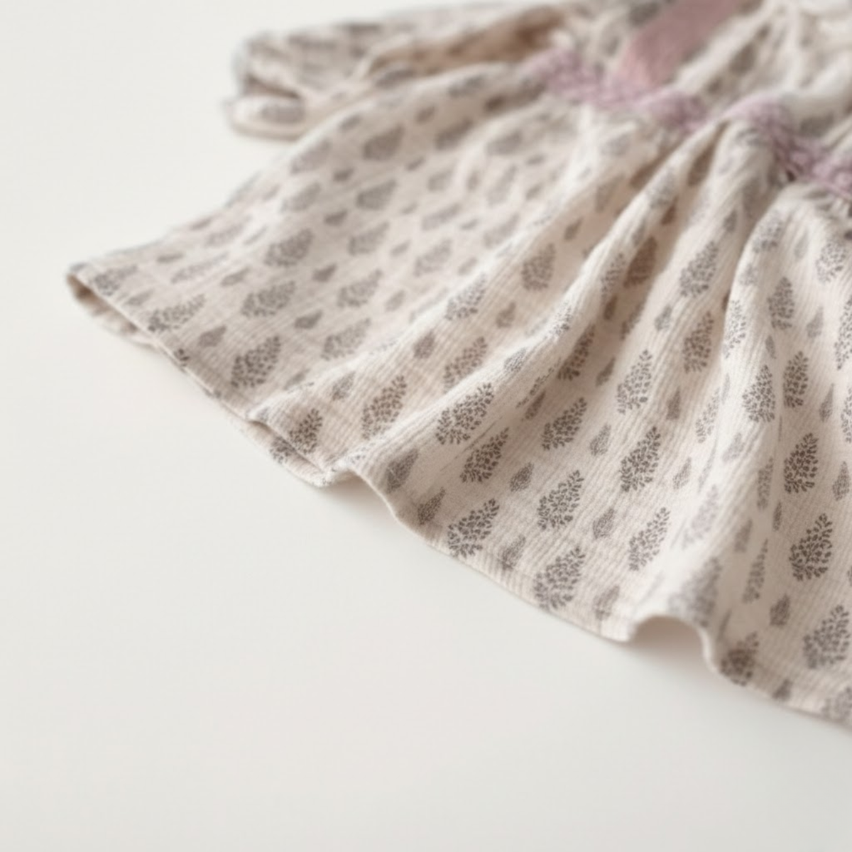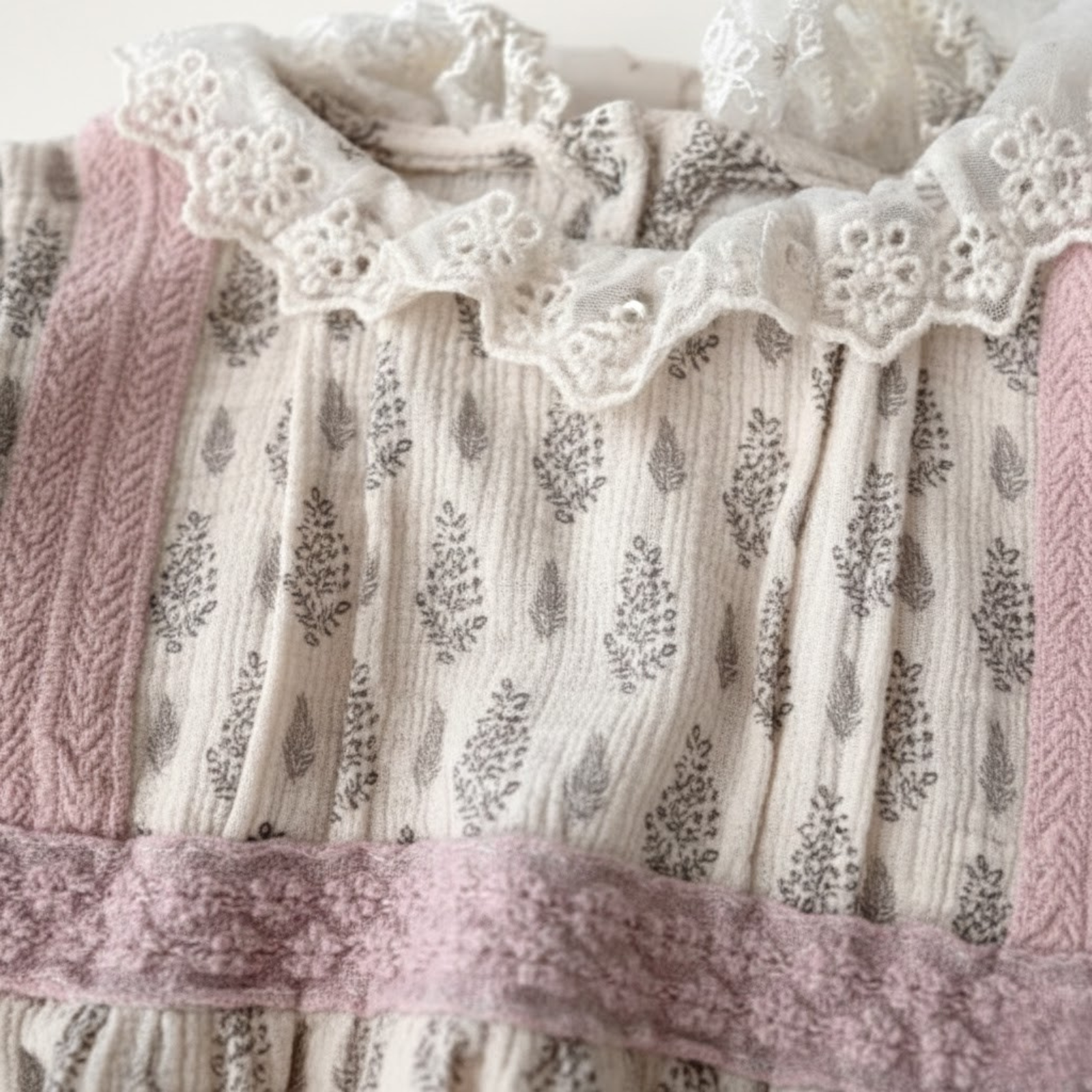 Designed for babies 73-90 cm, this A-grade skin-friendly dress is ultra-gentle on delicate skin. The cozy cotton-blend fabric features a soft neutral floral print, a charming lace-ruffle collar, and sweet pink ribbon accents at the waist. Lightweight yet cozy—perfect for photoshoots, family gatherings, or everyday pretty looks.