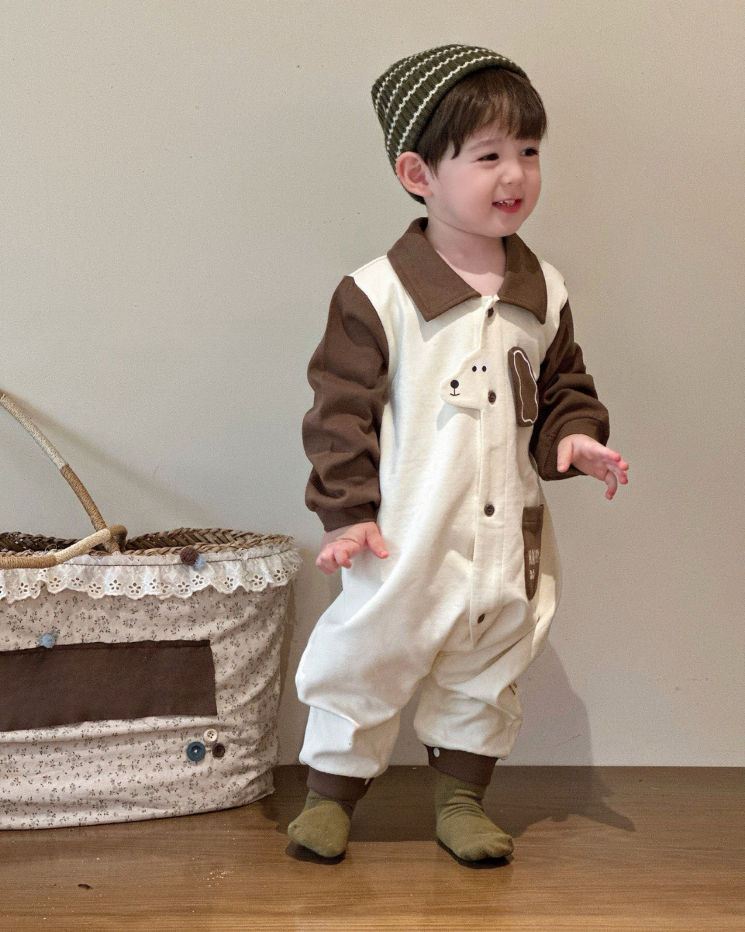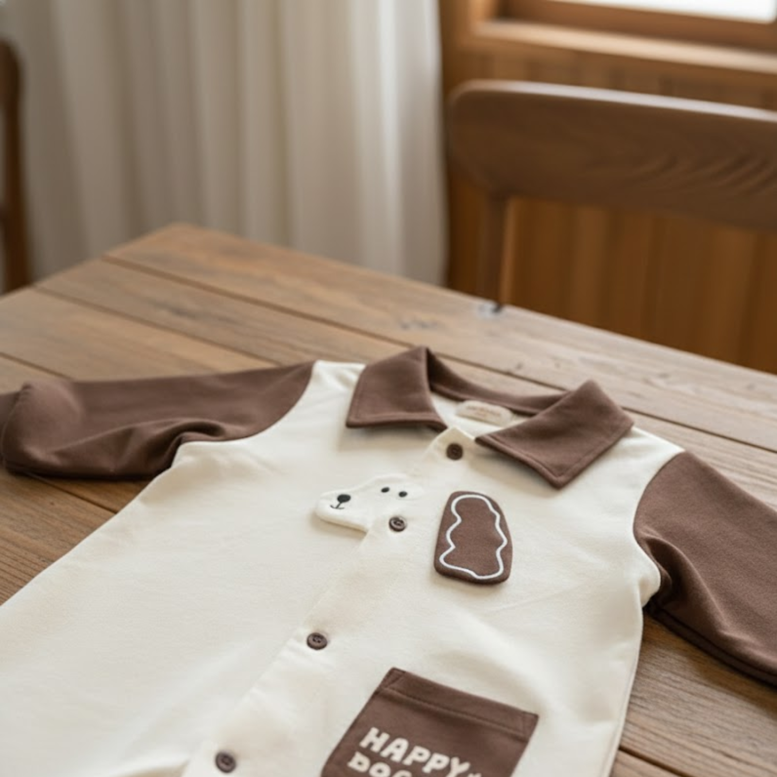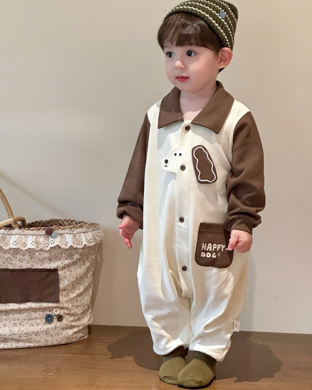 Adorable “Happy Dog” jumpsuit for little ones! 🐶 Featuring soft cotton fabric, playful dog embroidery, and a comfy button-down design for easy changing. The contrast color sleeves and collar add a stylish touch while keeping your baby cozy and free to move. Available in Brown and Black. Perfect for daily wear, playtime, or cute photoshoots!