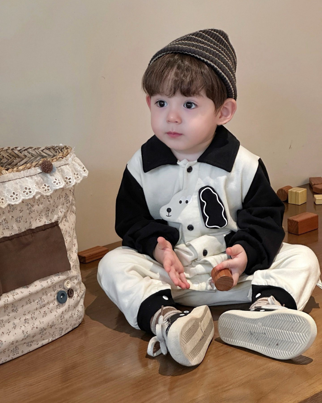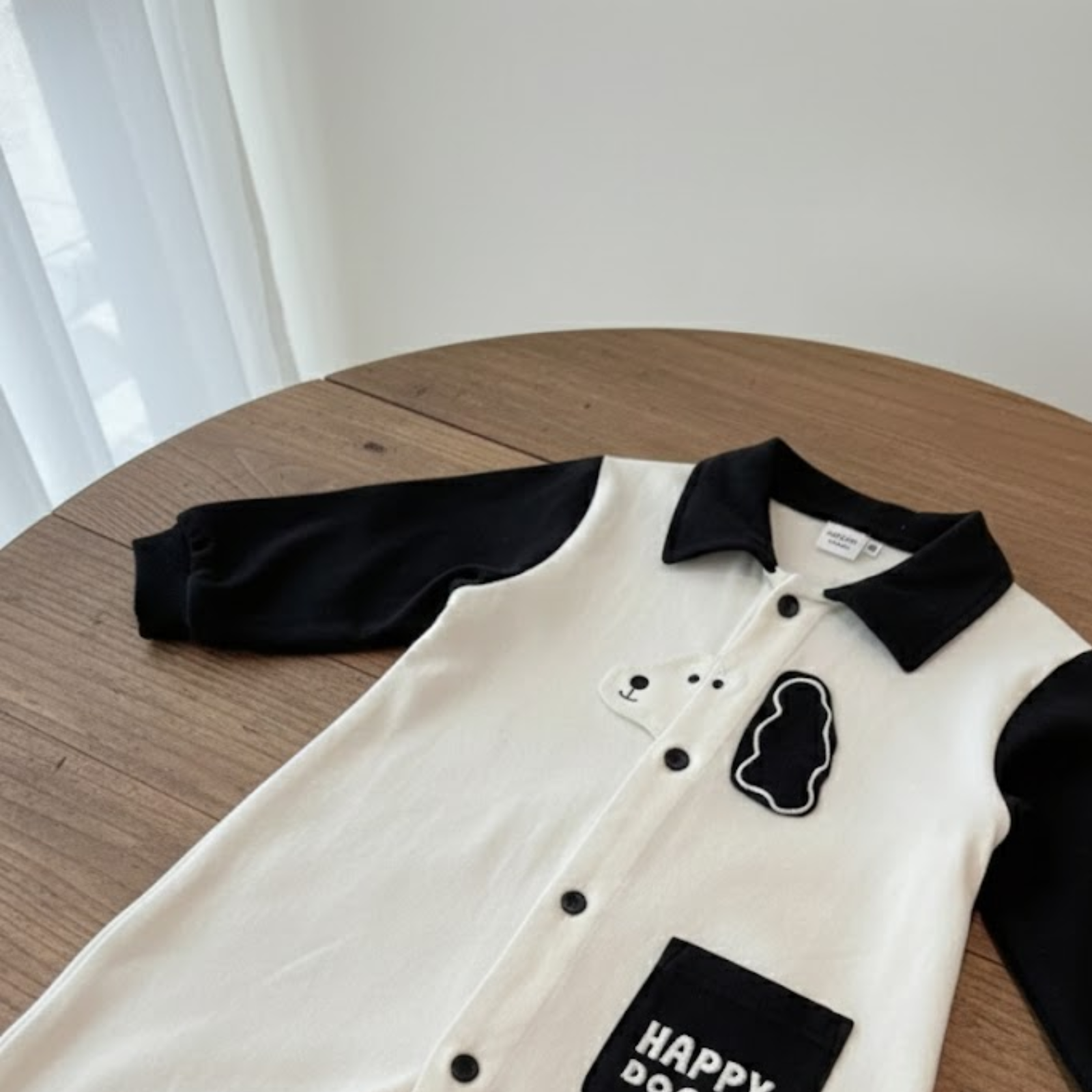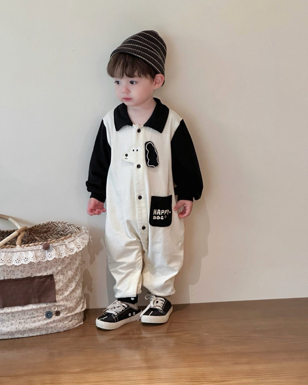 Adorable “Happy Dog” jumpsuit for little ones! 🐶 Featuring soft cotton fabric, playful dog embroidery, and a comfy button-down design for easy changing. The contrast color sleeves and collar add a stylish touch while keeping your baby cozy and free to move. Available in Brown and Black. Perfect for daily wear, playtime, or cute photoshoots!
