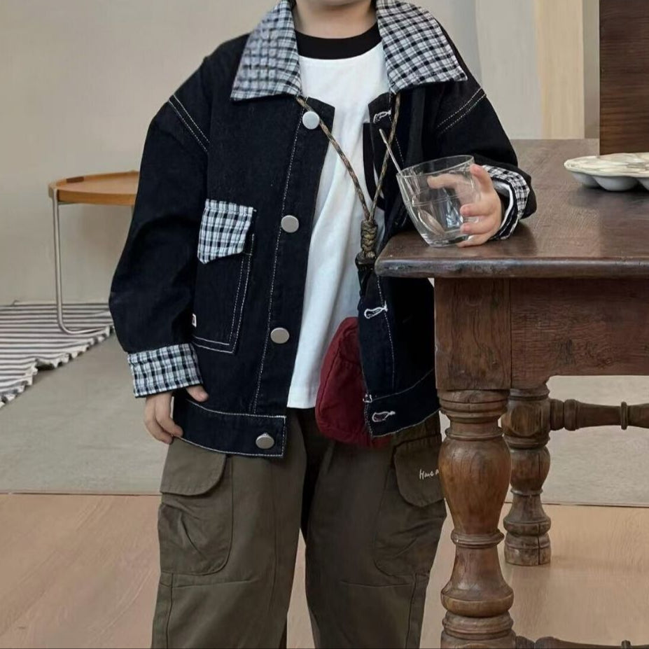 A stylish denim jacket with checkered patchwork details on the collar, cuffs, and pocket. Designed with contrast stitching and snap buttons for easy wear, this jacket brings a playful yet cool vibe to your child’s wardrobe. Perfect for layering over tees or sweaters, it’s a versatile piece for both casual outings and special occasions.