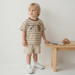 用我們的小狗和小熊晾衣繩T卹,為日常穿搭增添一抹俏皮!這款T卹採用柔和的米色和棕色條紋,撞色的棕色領口,以及可愛的小狗和小熊掛在晾衣繩上的印花,充滿魅力,穿著舒適。