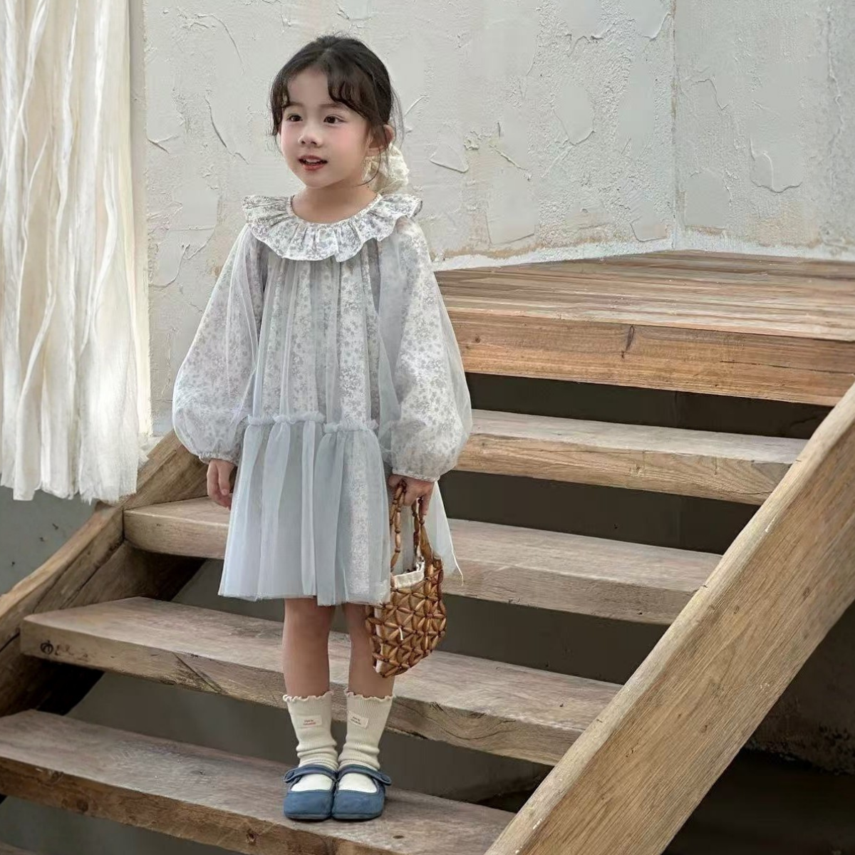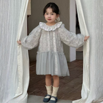 當童話邂逅時尚。這件迷人的洋裝飾以精緻柔和的灰色花卉印花,並以輕盈的淺藍色薄紗加以點綴,更顯輕盈飄逸。其戲劇性的荷葉邊領口和飄逸的廓形,使其成為一件夢幻般的單品,專為特殊時刻和奇幻遊戲而設計。