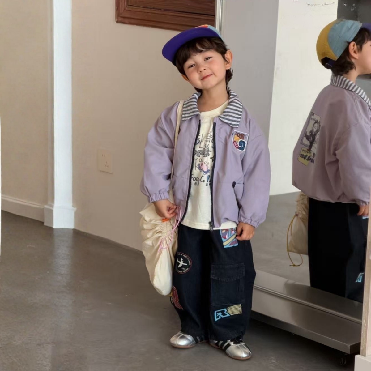 這款淡紫色風衣融合了街頭潮流與復古韻味,巧妙地將美式復古風格與現代都會時尚融為一體。其亮點在於撞色條紋領口,營造出層次感,搭配活力四射的紫色,讓任何造型都瞬間亮眼。背後的趣味「Tiny Snack Bar」圖案,則為孩子的衣櫥增添了一抹奇趣。
